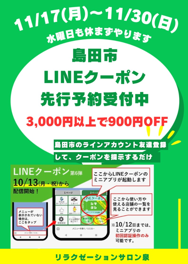 **島田市LINEクーポン(3,000円以上の施術で900円OFF)**がご利用いただけます。