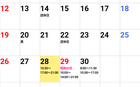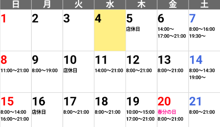 お休みの日はカレンダーまたは公式LINEにてお知らせいたします。
